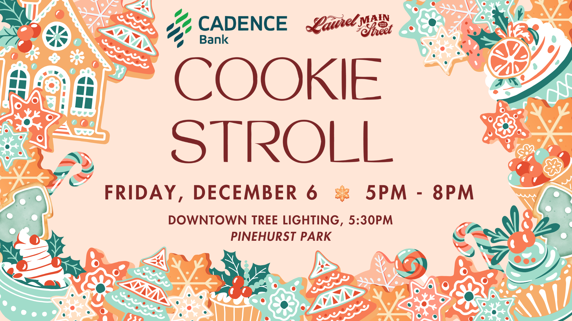 Join us in Downtown Laurel as the Cadence Bank Cookie Stroll transforms downtown into a magical holiday wonderland, where local shops keep their doors open late while offering free Christmas cookies and festive experiences for families. Visitors can capture cherished memories with photo opportunities alongside Santa Claus and the Grinch, while experiencing the enchantment of snow falling in the downtown streets. The evening kicks off with joyful community caroling as everyone gathers to illuminate the downtown Laurel Christmas tree, creating a heartwarming celebration of holiday spirit.